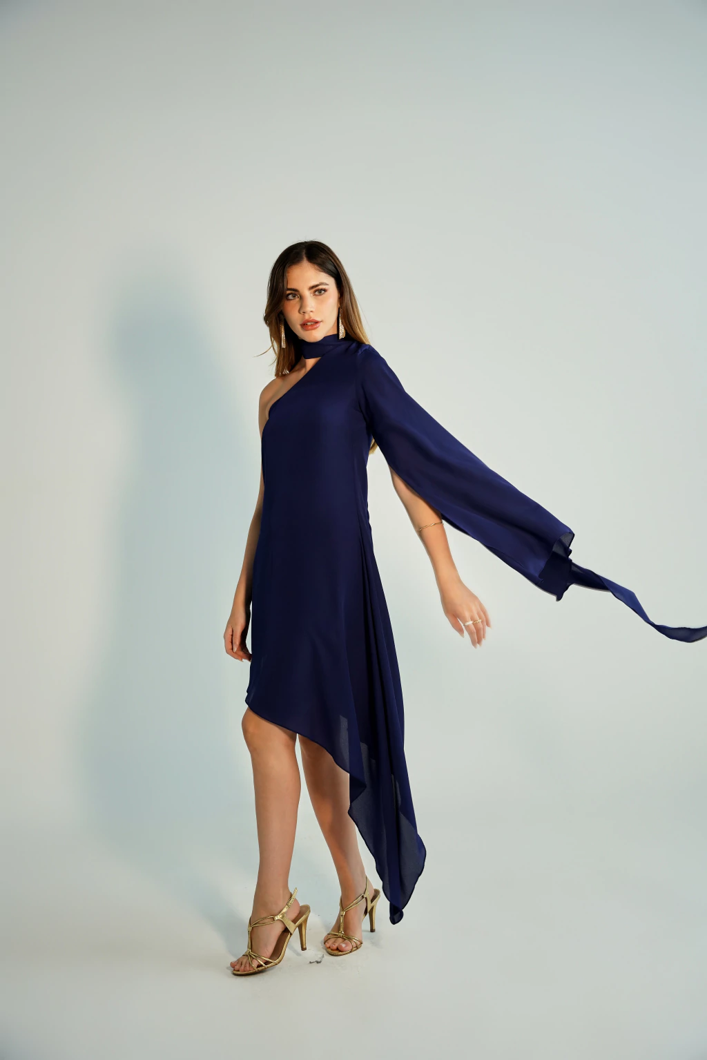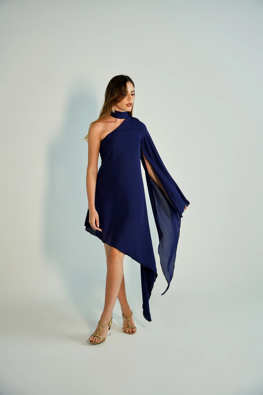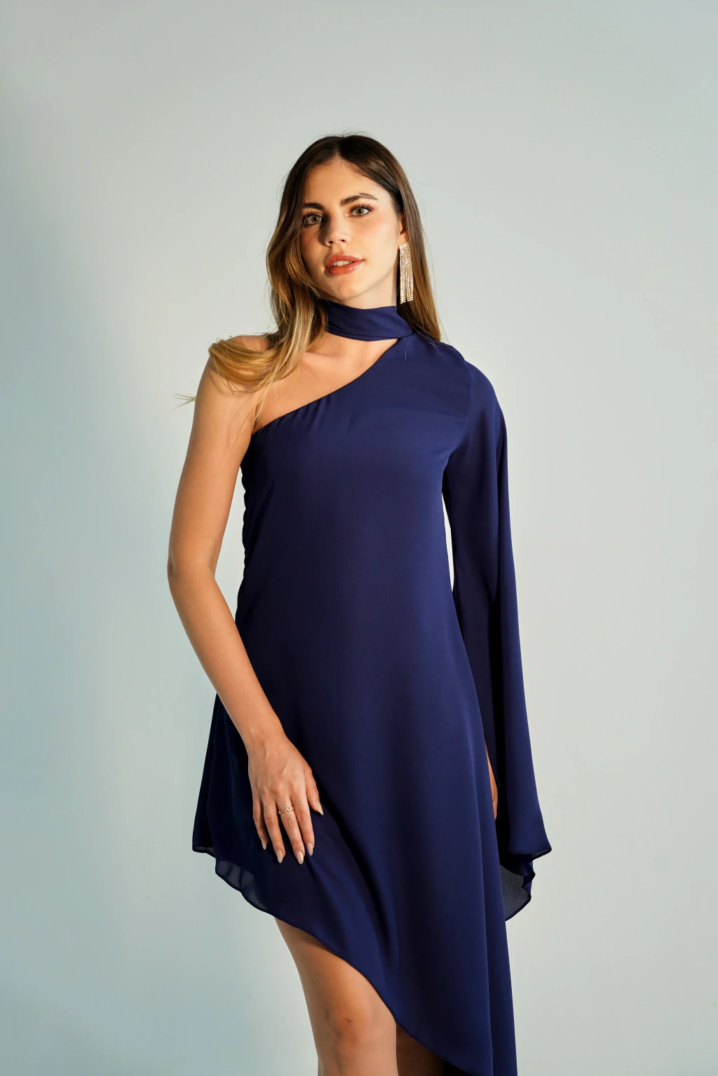Vestido curto com modelagem moderna e elegante. Possui uma ponta assimétrica, que traz modernidade para a peça. A manga possui um recorte estratégico para proporcionar maior conforto e leveza, permitindo movimentar o braço tranquilamente, sem nenhum incômodo. O zíper é invisível e embutido no tecido, proporcionando um acabamento super delicado e sofisticado, além de evitar que pinique a pele. A amarração no pescoço é bem longa, o que traz um ar elegante para a peça. Ela é confeccionada no crepe georgete, um tecido de excelente qualidade, leve, fluido e com um caimento impecável! Uma peça que promete te surpreender em todos os sentidos! :)