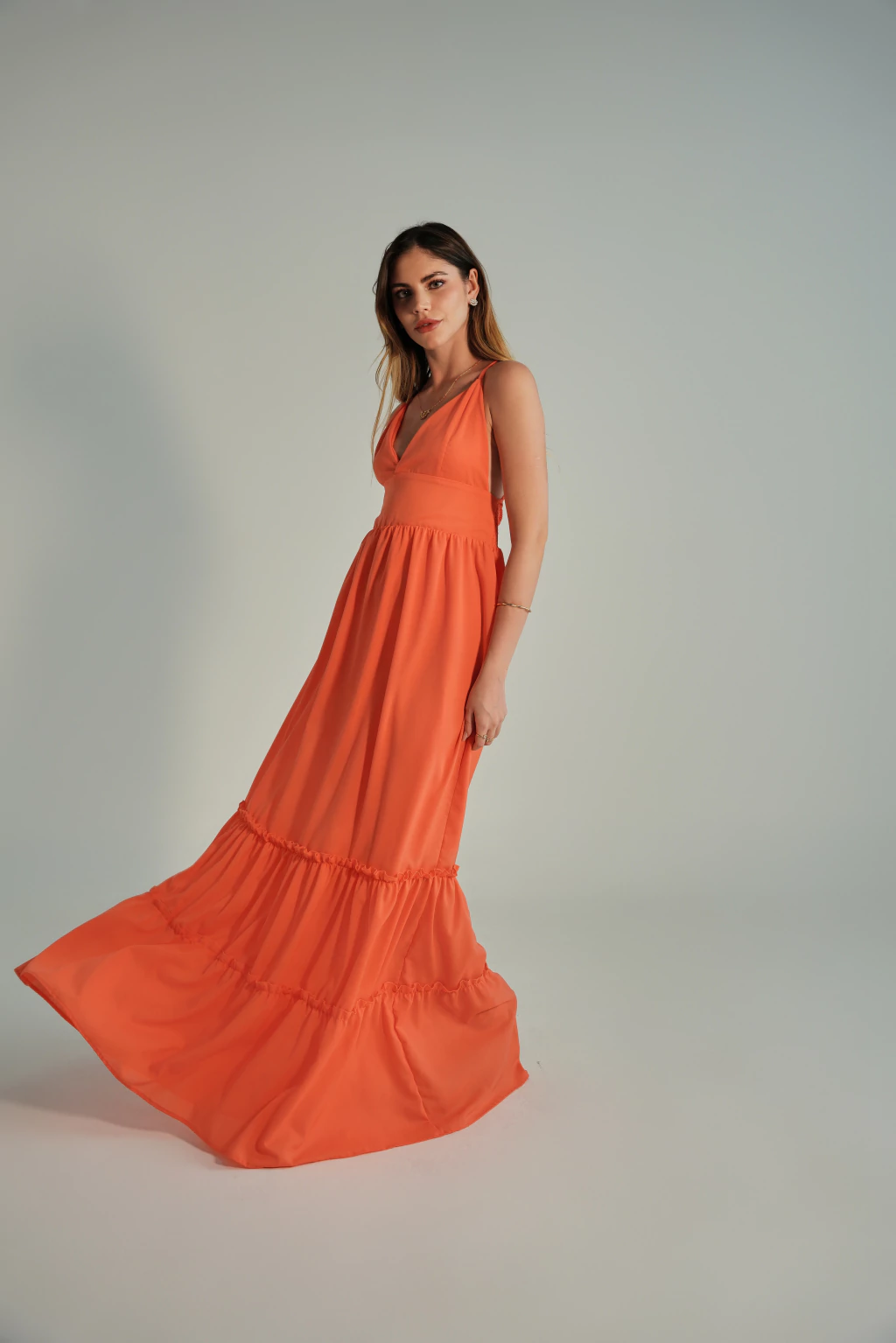Vestido longo com modelagem romântica e elegante. Possui camadas em babados, um decote em v lindíssimo que realça o colo e amarração. É uma peça toda ajustável, então é possível alterar o tamanho do decote através da amarração nas costas. Além disso, possui lastex nas costas, o que faz com que ele tenha o encaixe perfeito. O tecido é leve, fluido, e macio ao toque, super gostoso de usar! Pode ser usado desde um almoço em um restaurante até uma festa de casamento, tudo vai depender dos acessórios e sapatos que você utilizar.