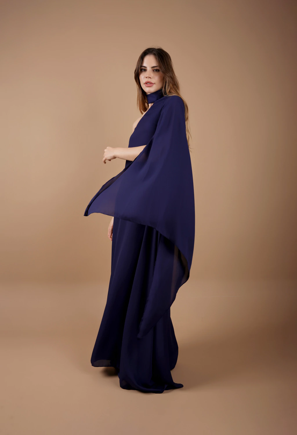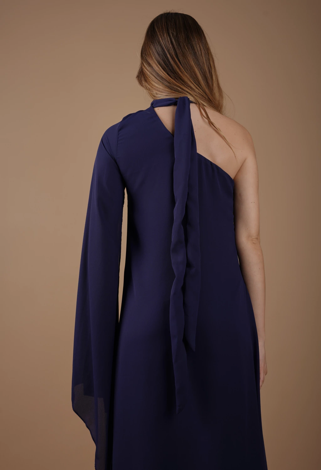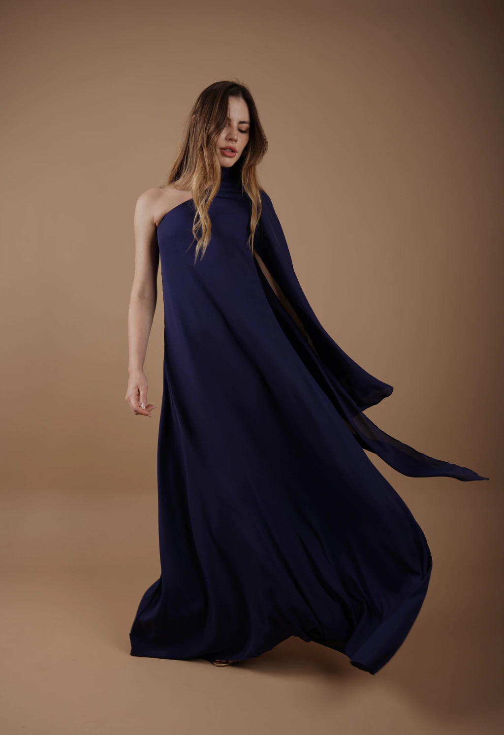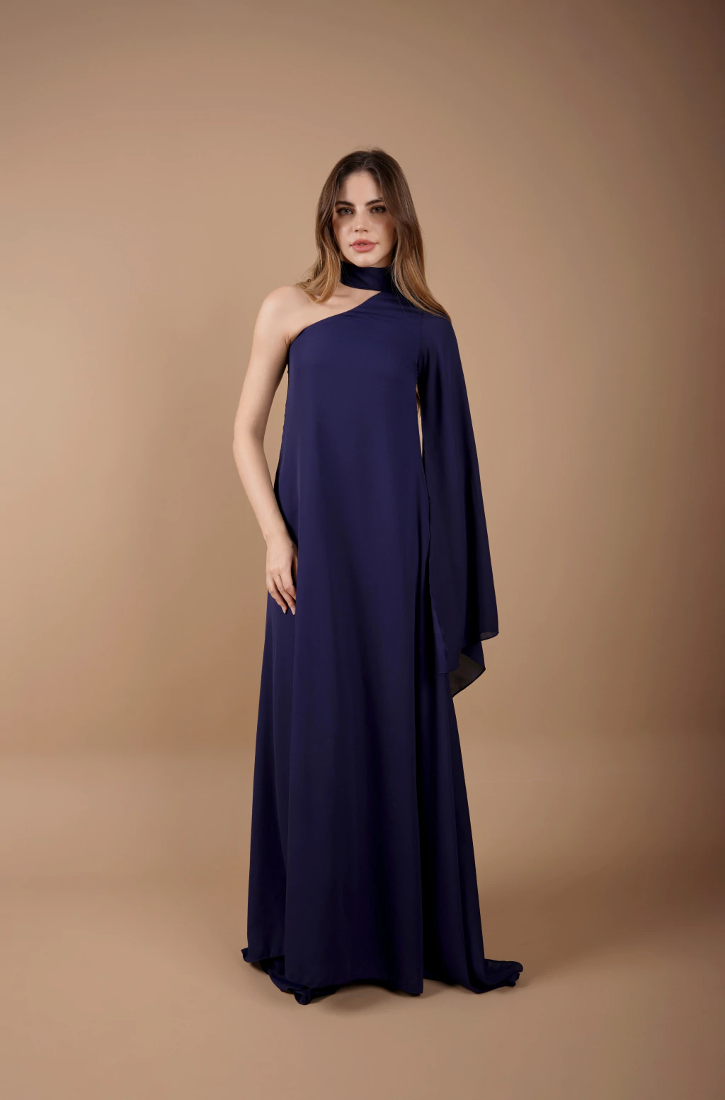 Vestido longo maravilhoso, com modelagem moderna e elegante. Possui fechamento em zíper na lateral, uma manga ampla de um ombro só e com recorte, e uma amarração no pescoço que é embutida na peça. Ideal para ocasiões mais especiais, como formaturas e casamentos. O tecido é leve, fluido, macio ao toque, e tem um caimento maravilhoso no corpo!